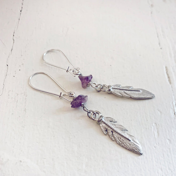 - amethyst earrings measure approx. 2-1/2" (6.35 cm) long from the top of the ear wire to the bottom tip of the feather charm.